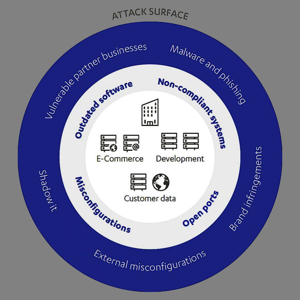 An organization’s attack surface crosses all network infrastructures, software, and web applications internally and in the global Internet. It includes an understanding of all points of interaction.