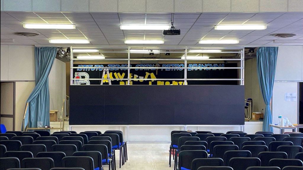 • Flessibilità: La presenza di un maxi schermo rende l’aula magna più flessibile. Può essere utilizzato per diverse esigenze, come proiezioni cinematografiche, presentazioni artistiche o dimostrazioni scientifiche.